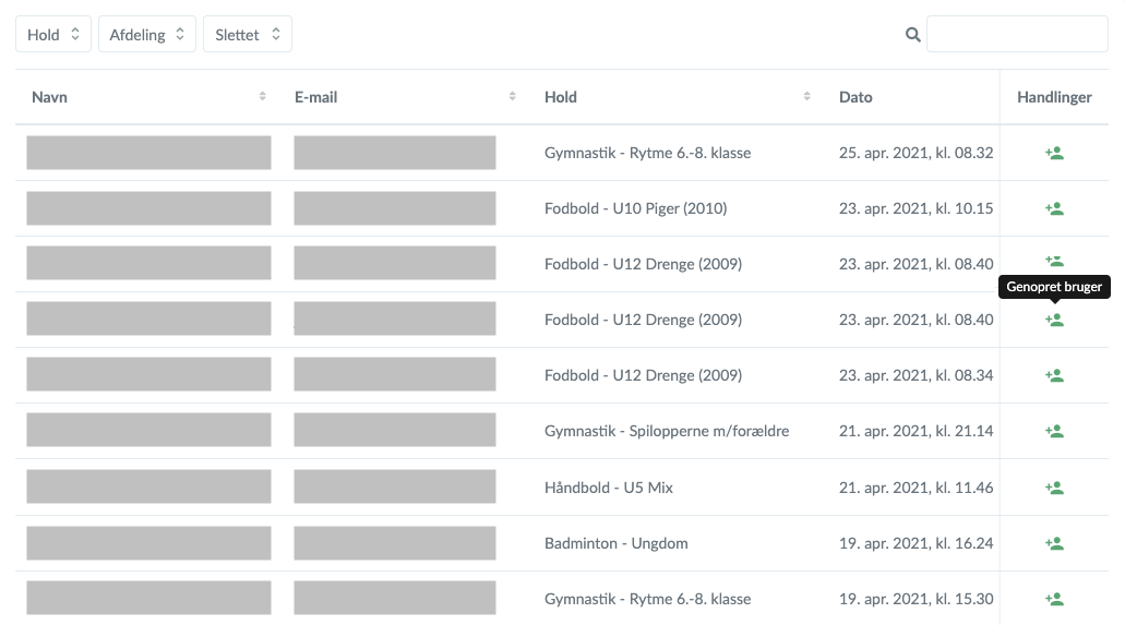 Alle slettede medlemmer dukker nu op i en tabel listet op efter nyest slettede. Find medlemmets navn (søg evt. i søgefeltet) og klik på under Handlinger yderst til højre ud for medlemmets navn.