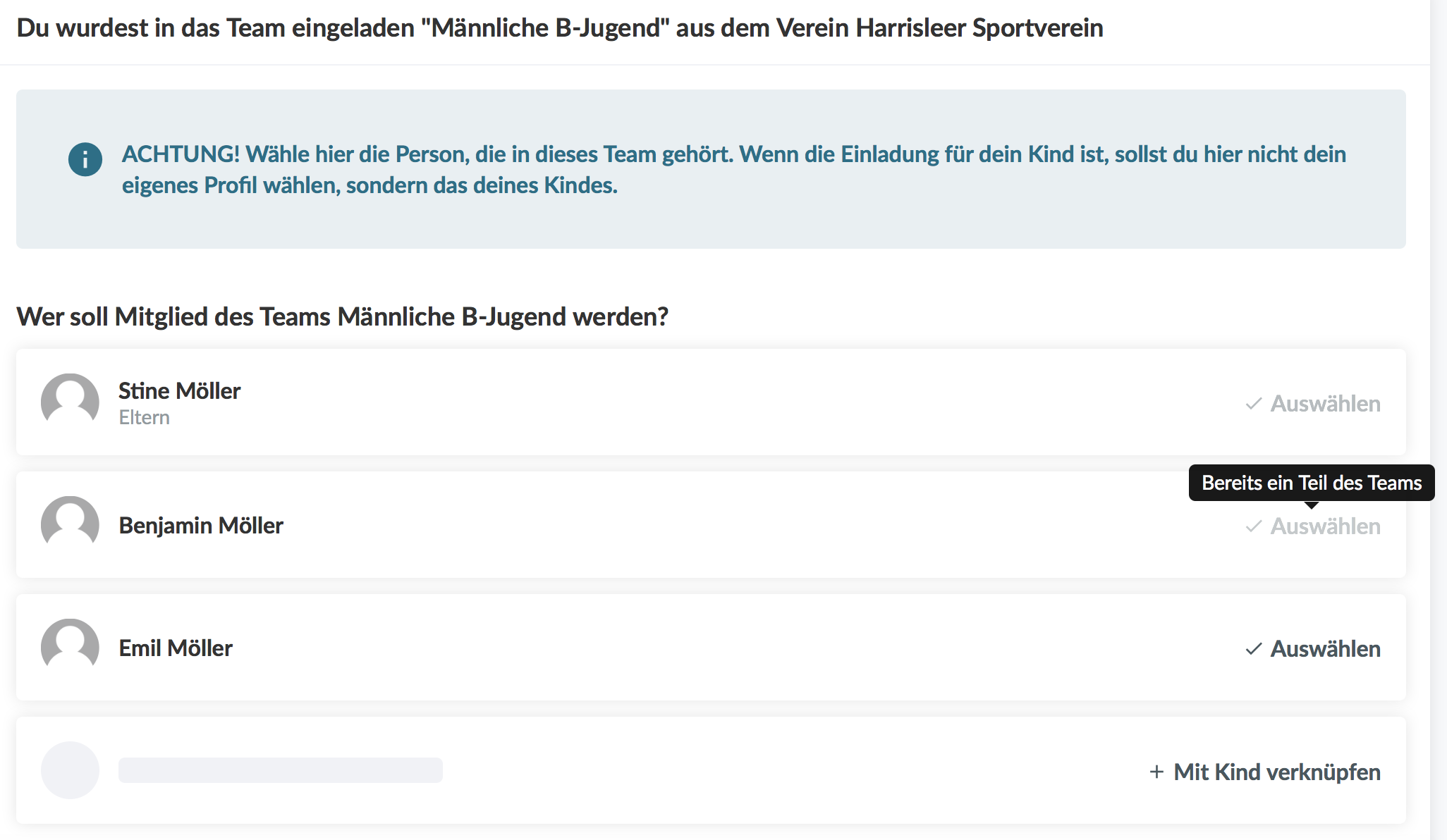 Beispiel: Hier ist Stine bereits bei SportMember eingeloggt und da sie (genau wie auch Benjamin) schon Mitglied des Teams ist, kann sie NICHT neu im Team angelegt werden. Emil ist mit Stine's Profil als Kind verknüpft, und da er noch NICHT im Team ist, kann hier die Einladung in seinem Namen angenommen werden.