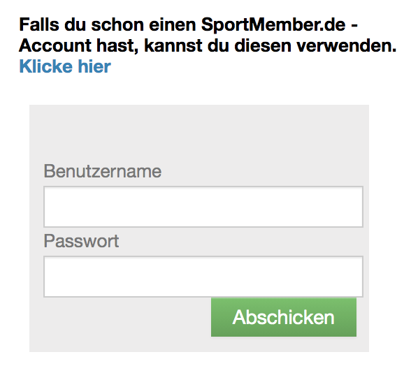 Benutzt du SportMember zum ersten Mal, wirst du hier wie folgt augefordert; Einloggen oder Neues Profil auf SportMember.de.