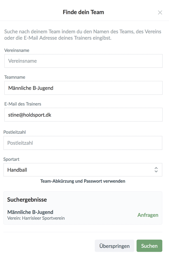 Gebe den Team- oder Vereinsnamen ein und klicke auf Suchen