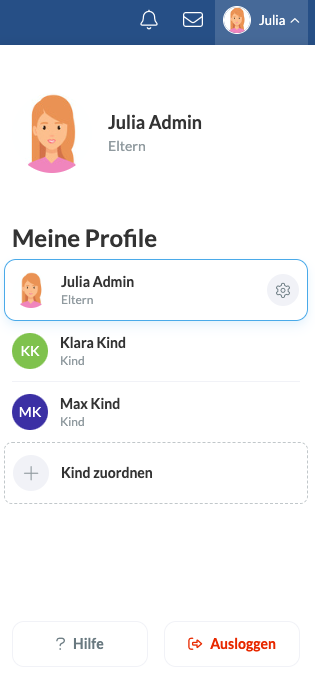 Beispiel: Dieses Elternprofil ist mit zwei Kindern verknüpft: Klara und Max