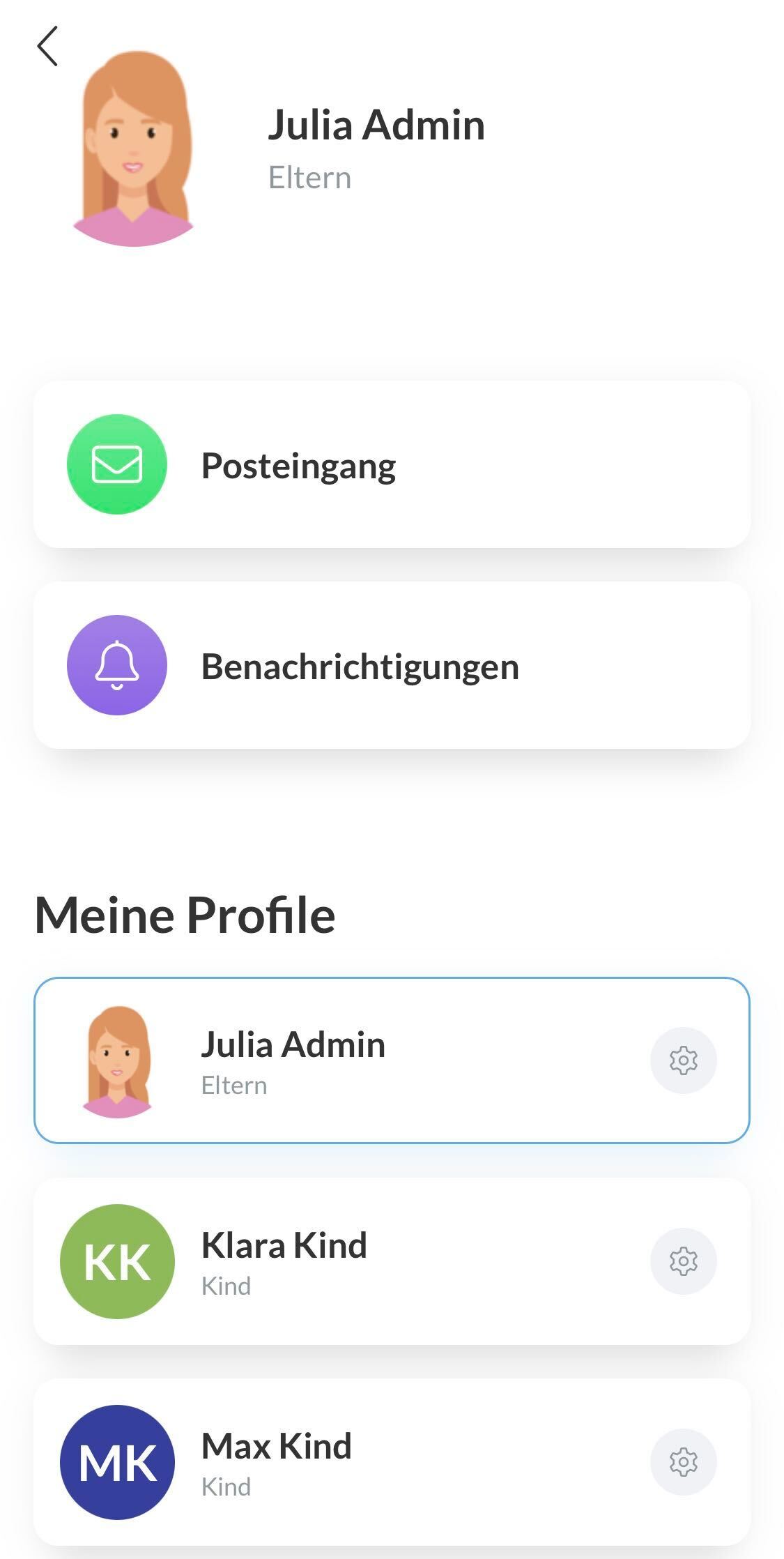 Beispiel: Das Benutzerprofil ist mit den Profilen der Kinder "Klara" und "Max" verbunden.