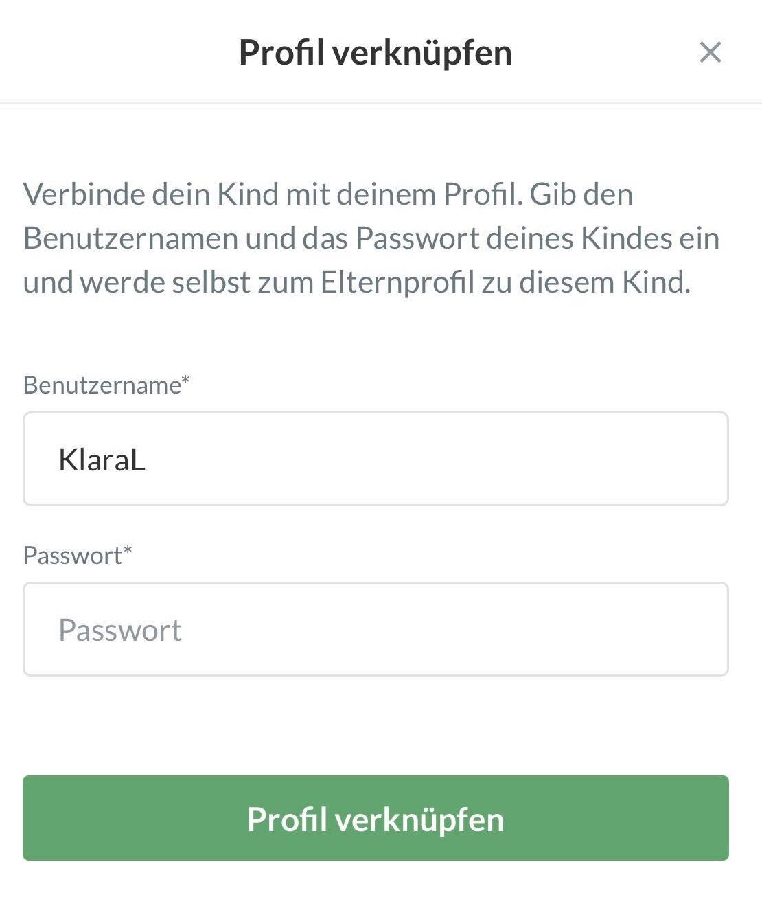 Verbinde das Profil deines Kindes mit deinem Profil, indem du den Benutzernamen und das Passwort deines Kindes eingibst.