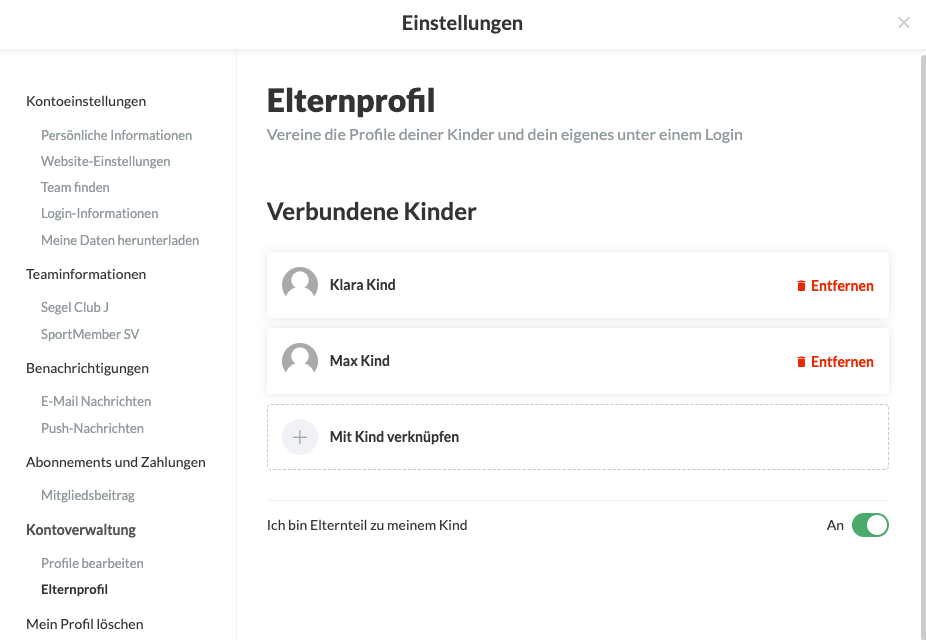 Du hast nun ein Elternprofil für das Profil deines Kindes eingerichtet. Dies bedeutet, dass du jetzt (als du selbst eingeloggt) Aktionen im Namen des Profils deines Kindes durchführen kannst.