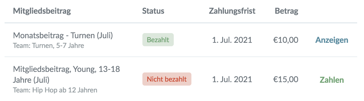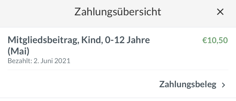Hinweis: Der Betrag wird grün angezeigt, wenn die Zahlung erfolgt ist. Wenn der Mitgliedsbeitrag noch ausstehend ist, wird der Betrag in grau angezeigt.