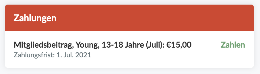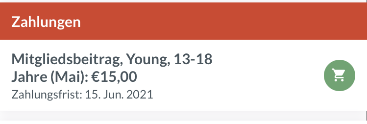 Hinweis: Der Betrag wird grün angezeigt, wenn die Zahlung erfolgt ist. Wenn der Mitgliedsbeitrag noch ausstehend ist, wird der Betrag in rot angezeigt.