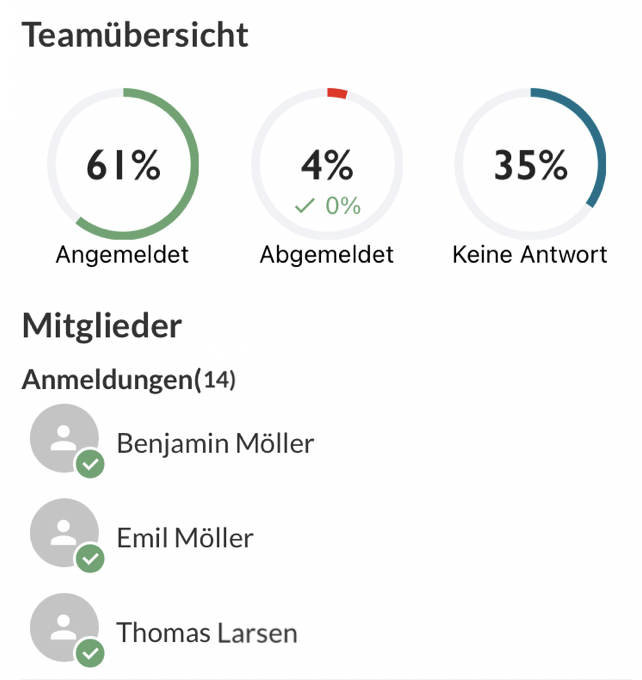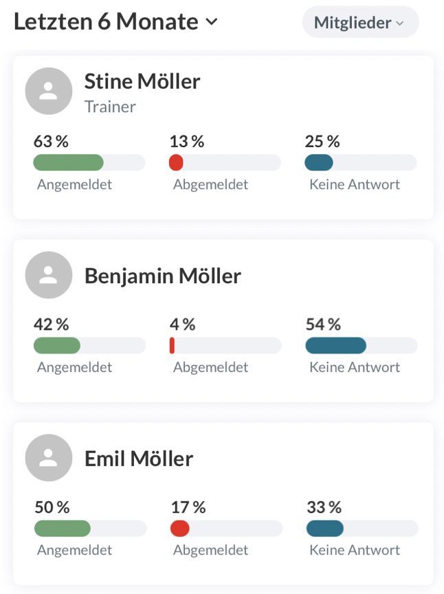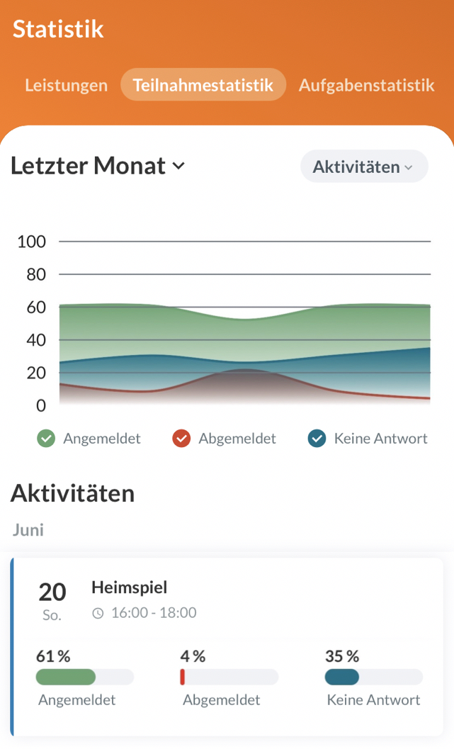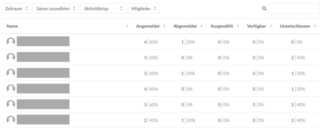 In der Filter-Ansicht Mitglieder können erweiterte Teilnahmestatistiken für dich selbst oder auch ein Teammitglied einsehen werden. Hierbei kannst du genau sehen, für welche Aktivitäten du dich angemeldet bzw. von welchen du dich abgemeldet hast.