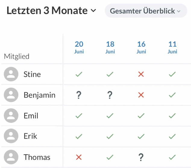 Nun wird dir eine automatisierte Statistik über die Anwesenheit deines Teams angezeigt. Diese kannst du nach Belieben vollständig anzeigen lassen oder aber auch nach den Folgenden Kriterien filtern: