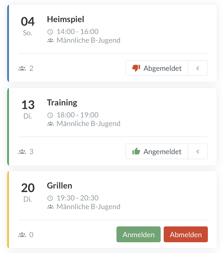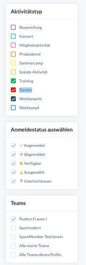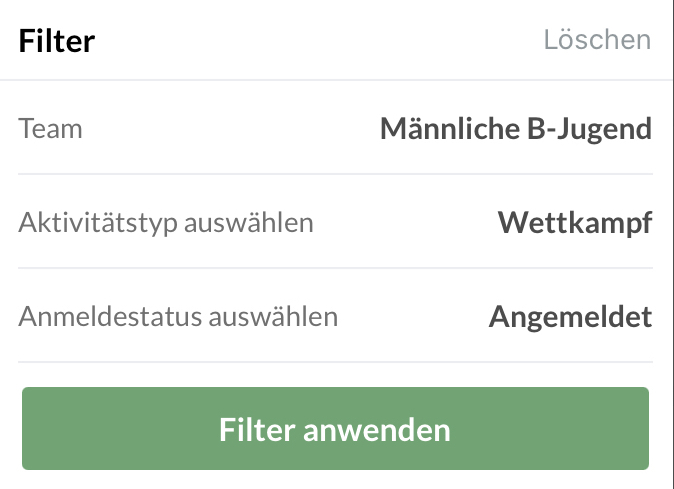 Beispiel: Hier hast du entschieden, dass der Kalender nur Spiele für das Team "Männliche B-Jugend" anzeigen soll. Außerdem werden nur die Aktivitäten angezeigt, bei der die Person angemeldet ist.