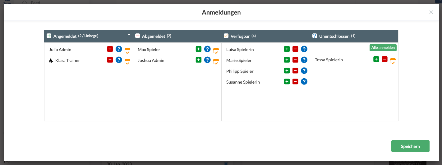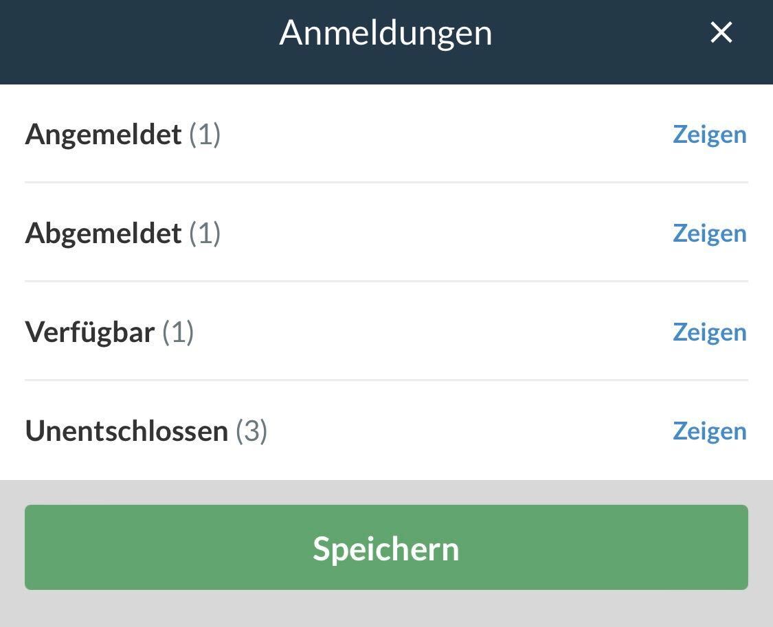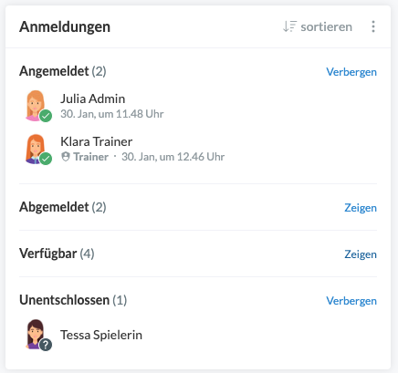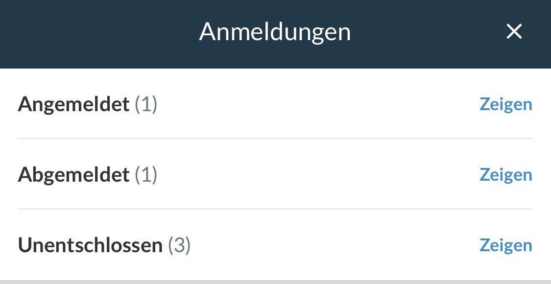 Nun werden dir die An- und Abmeldungen zu einer Aktivität in den folgenden Kategorien angezeigt, vorausgesetzt die Anmeldeart ist "Standard":