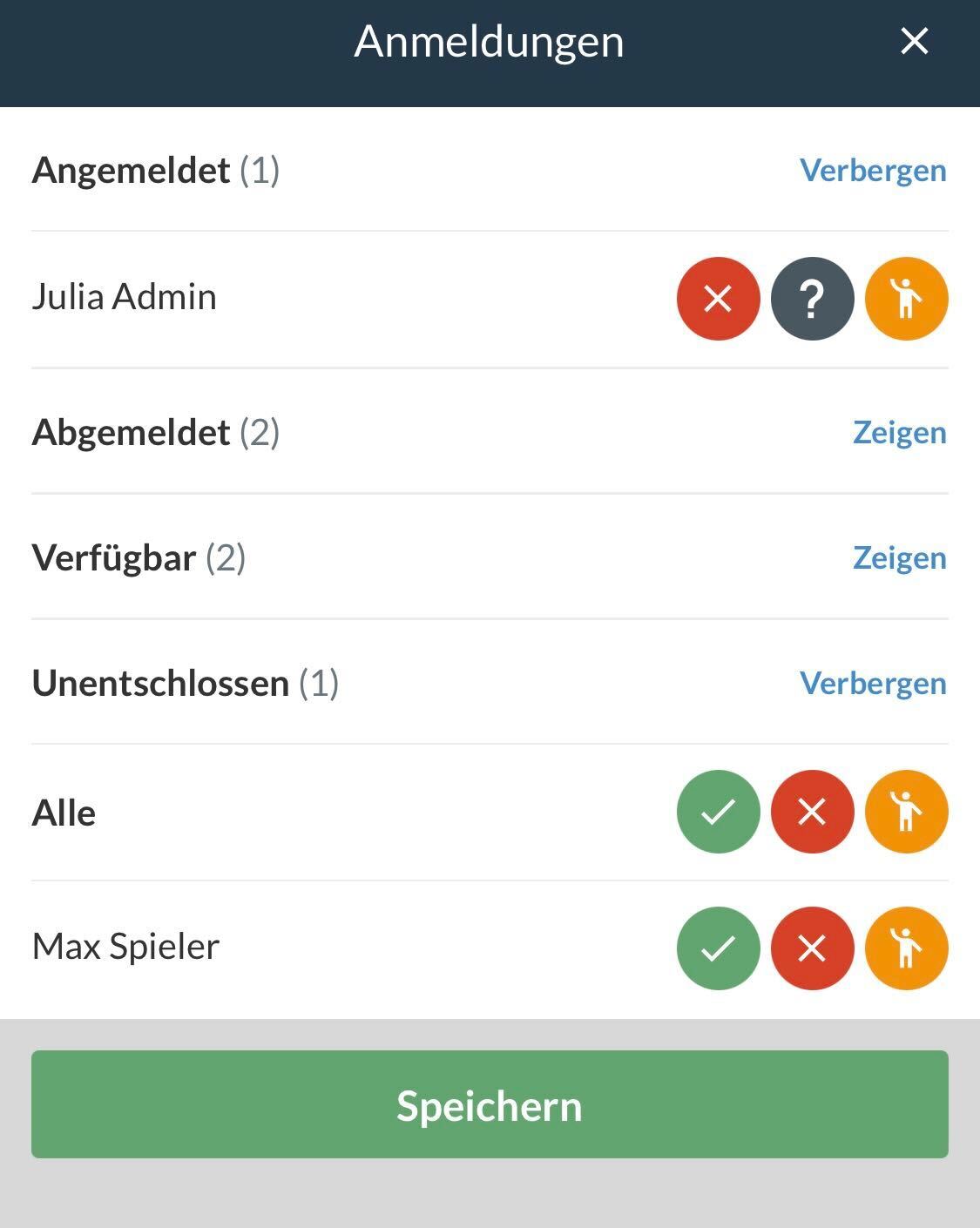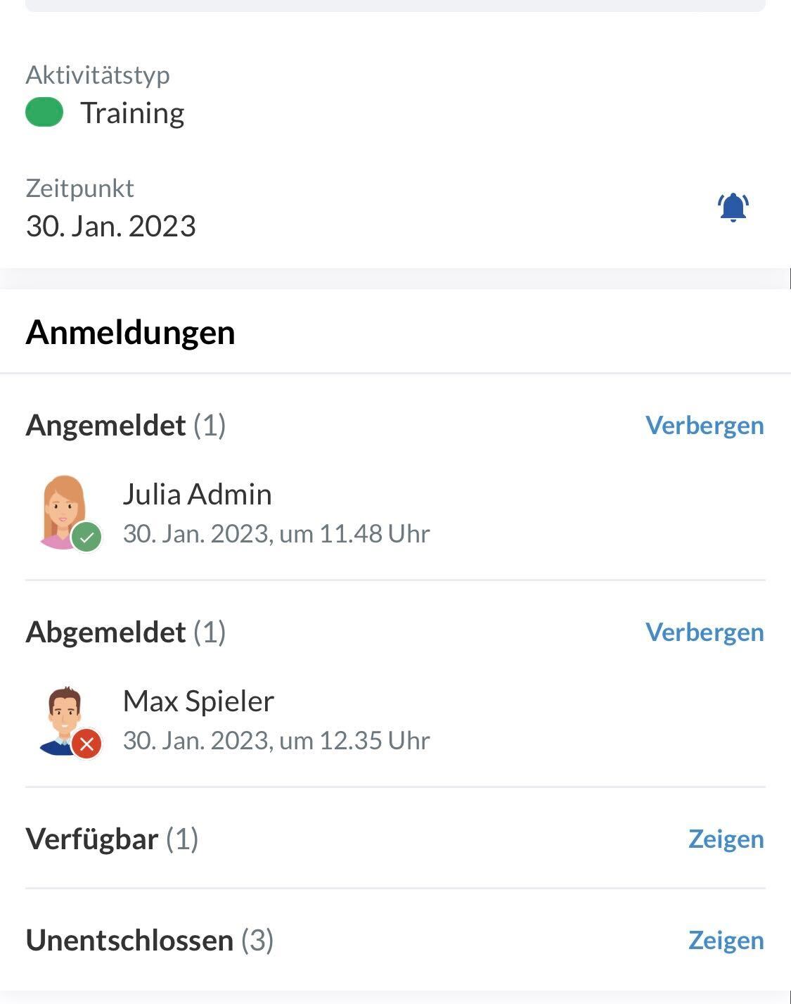 Beispiel: Die Aktivität ist mit der Anmeldeart "Verfügbar" erstellt worden. Nun kannst du die An- und Abmeldung verwalten.