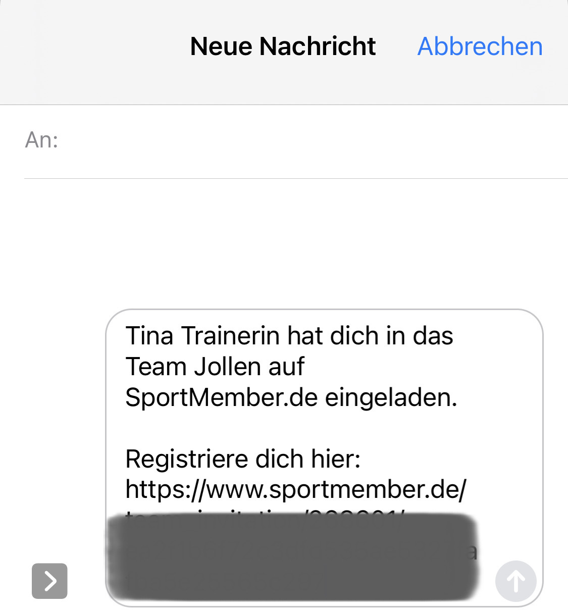So sieht z. B. die SMS mit dem einmaligen Einladungs-Link zu dem Team in SportMember aus. Sende sie an deine Kontakte, indem du auf das Plus-Symbol klickst.