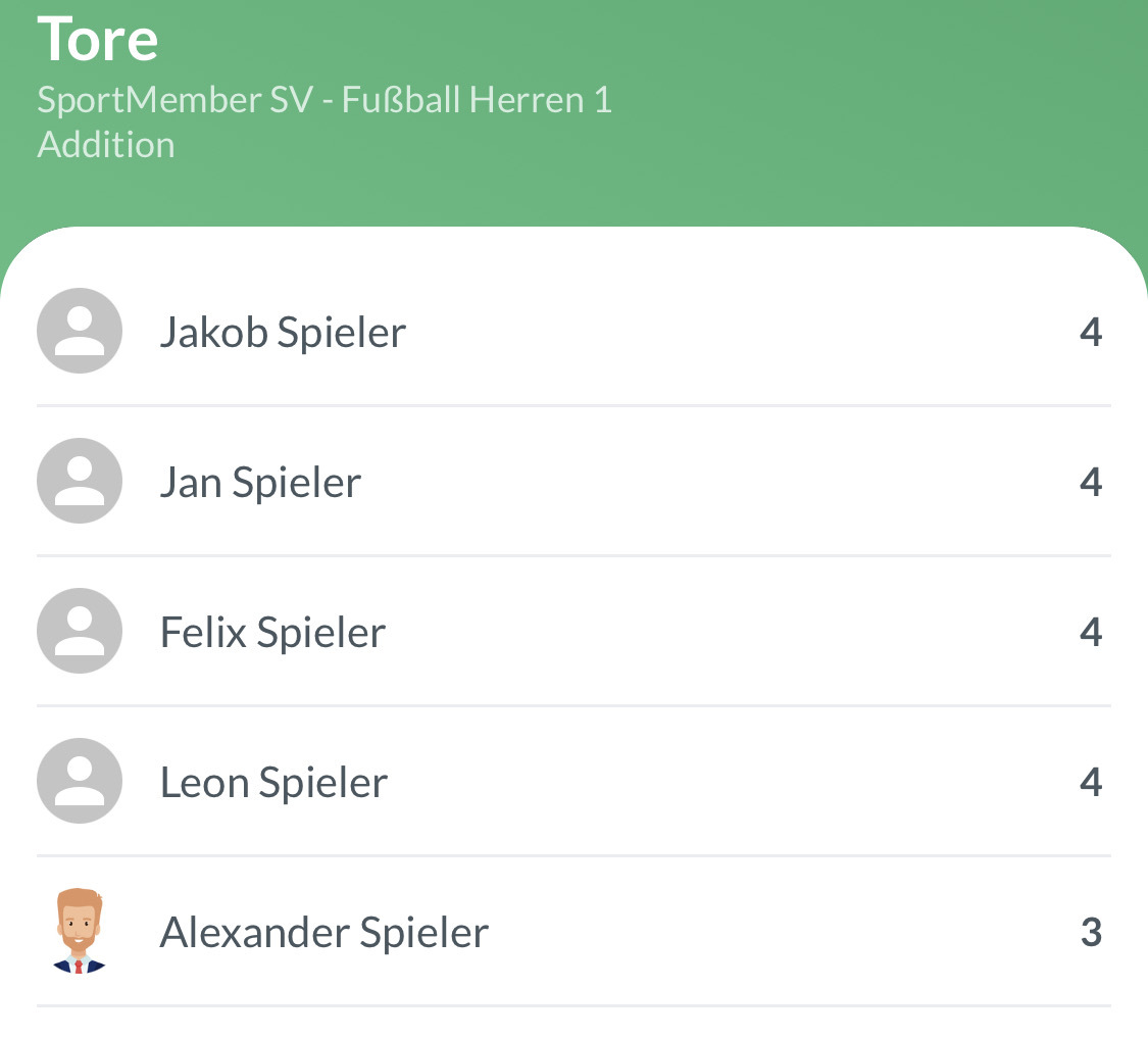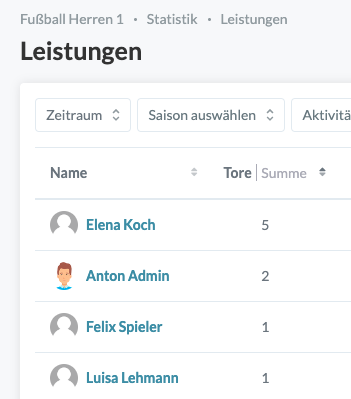 Beispiel: Elena hat in dem im Filter ausgewählten Zeitraum die meisten Tore für die Mannschaft erzielt (5).