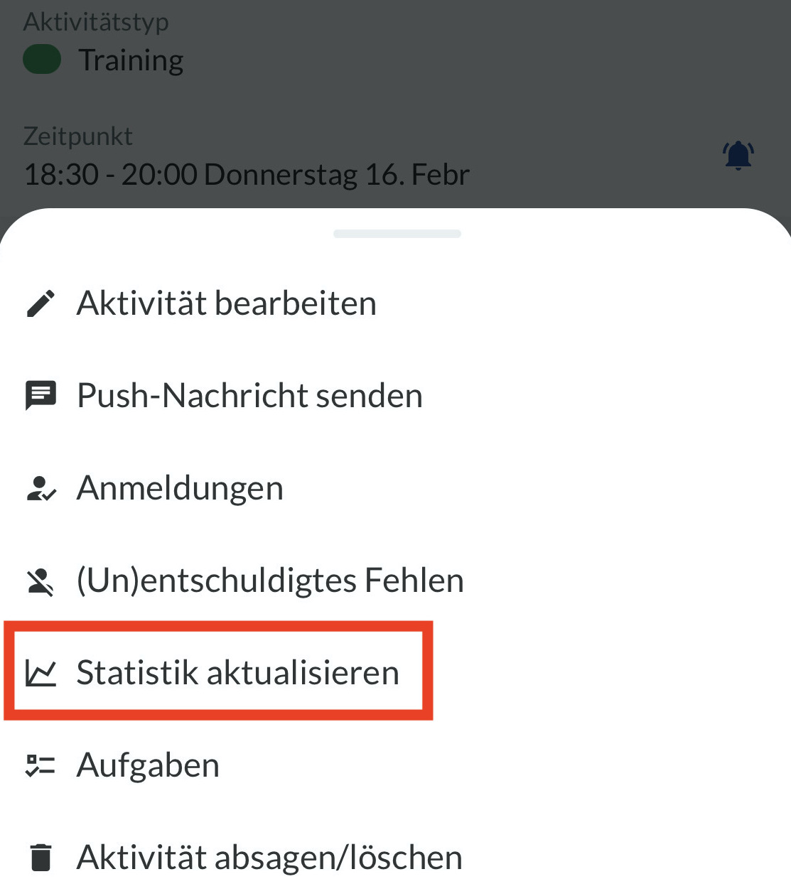 In Kalender kannst du Statistiken für abgeschlossene Aktivitäten erstellen. Die Statistiken werden mit den Aktivitäten verknüpft, die für das Team organisiert wurden. Das bedeutet auch, dass unter Statistik die Statistiken von Spielen, Trainingseinheiten und anderen sortiert werden können.