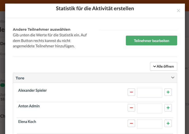 Wähle die passende Statistik und klicke auf + oder - neben dem/den bestimmten Mitglied(ern), um die Statistik zu aktualisieren