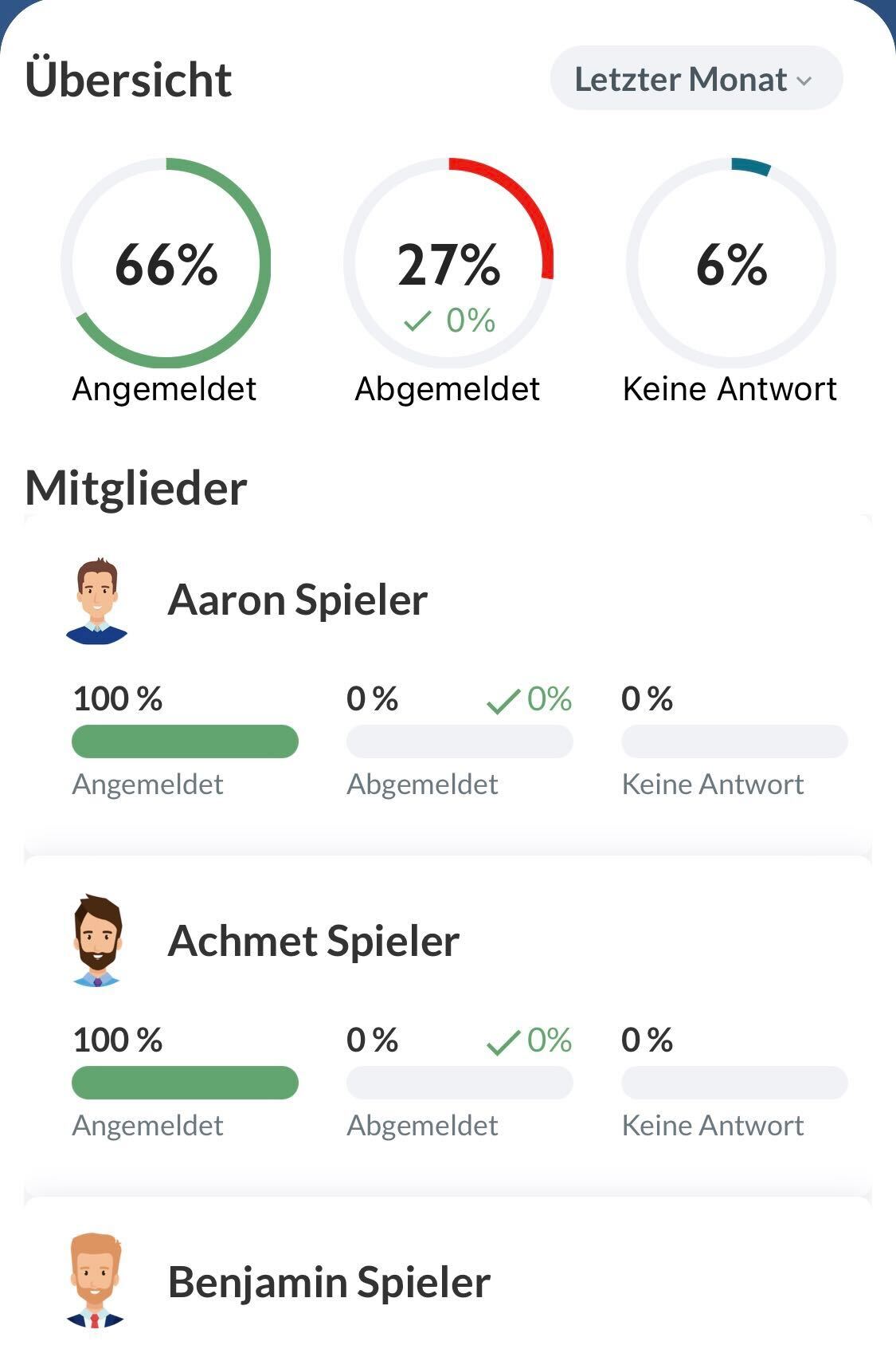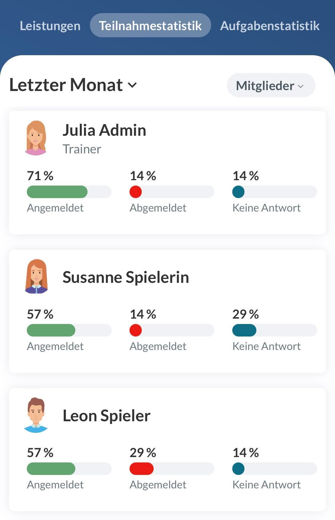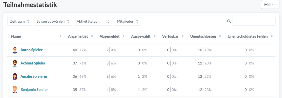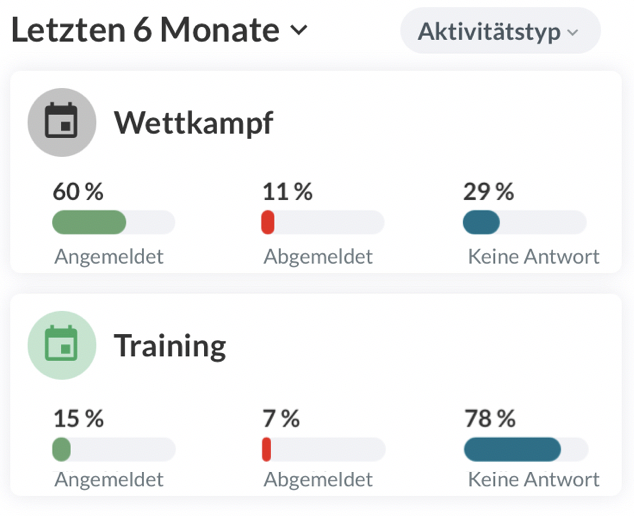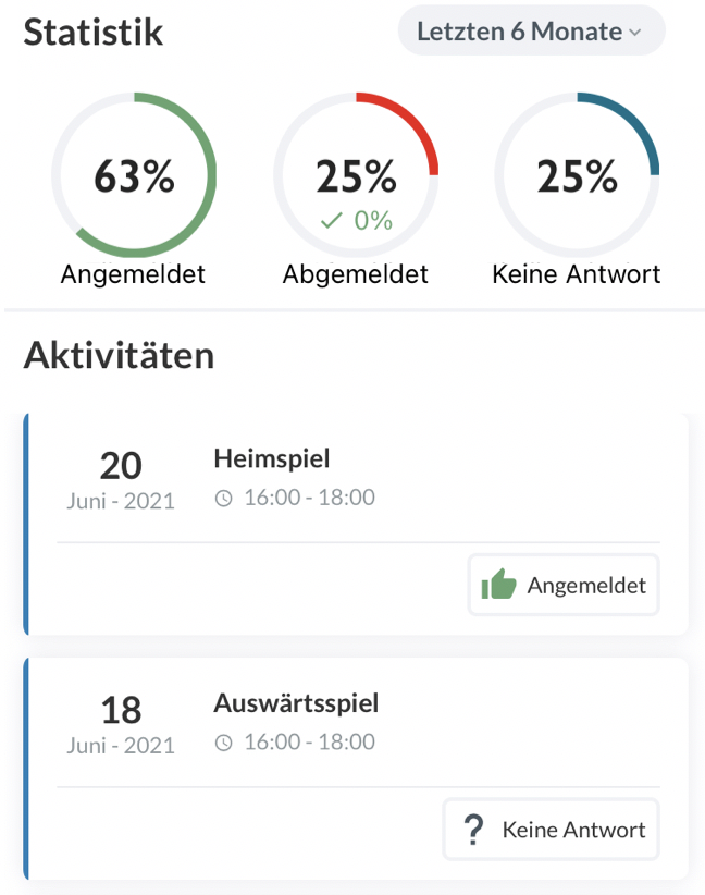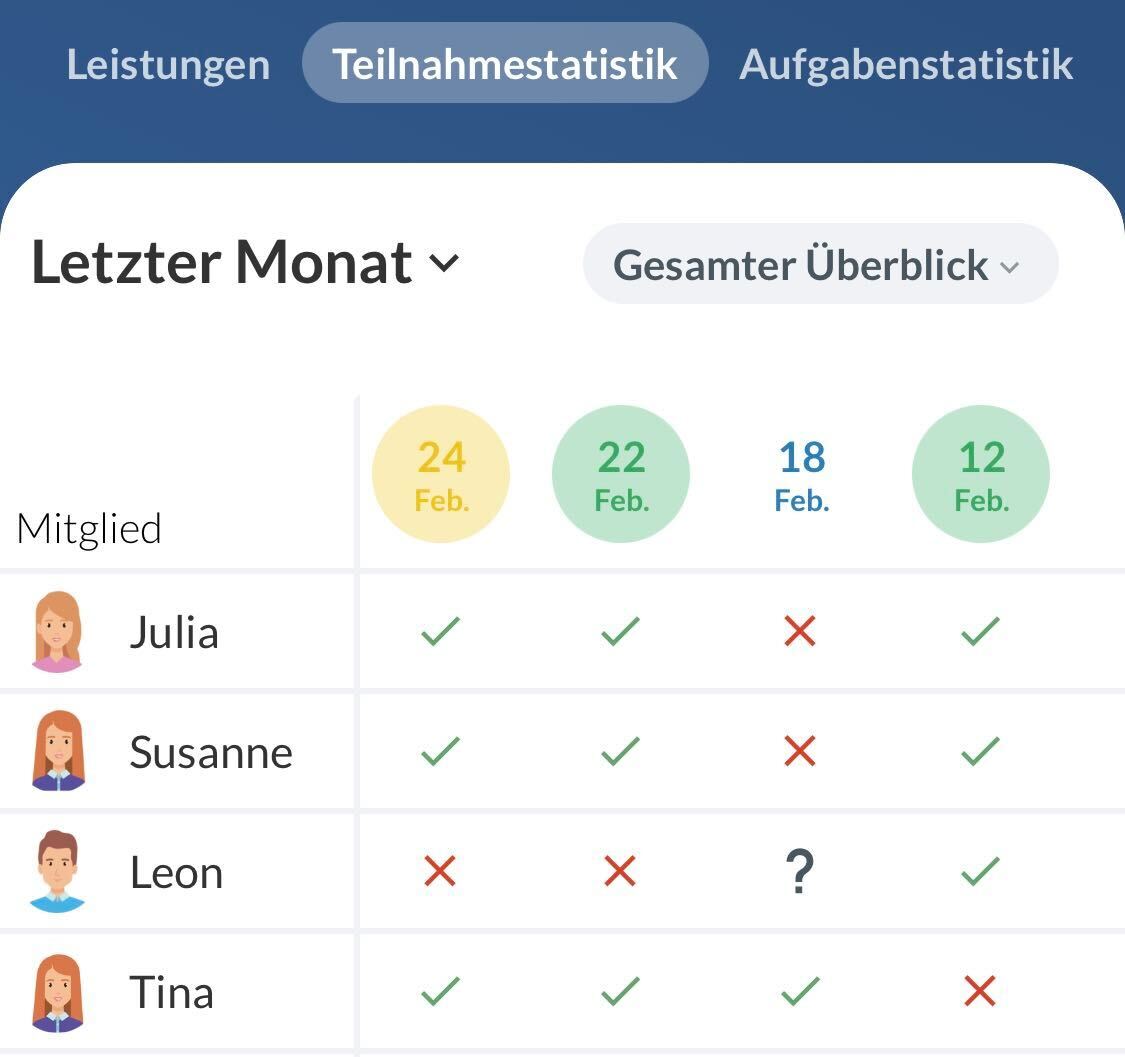 - Wenn Mitglieder später gelöscht/hinzugefügt werden, hat dies keinen Einfluss auf die Teilnahmestatistik von vergangenen Aktivitäten