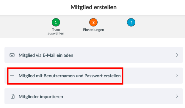 Dann kannst du zwischen drei Optionen auswählen, die du die Mitglieder erstellen willst. Wähle + Mitglied mit Benutzernamen und Passwort erstellen.