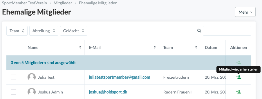 Alle gelöschten und somit ehemaligen Mitglieder werden nun in einer Tabelle aufgelistet, sortiert nach zuletzt gelöschten Mitgliedern. Suche den Namen des Mitglieds (ggf. im Suchfeld) und klicke auf unter Aktionen, rechts neben dem Namen des Mitglieds.