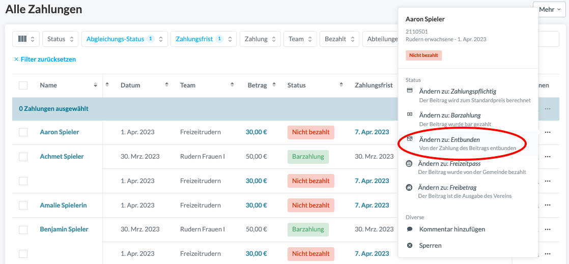 Du kannst außerdem überprüfen, ob der Vorgang korrekt durchgeführt wurde, indem du in Kommende Zahlungen gehst. Hier ist das Mitglied nun als Entbunden in der Spalte Status ersichtlich.