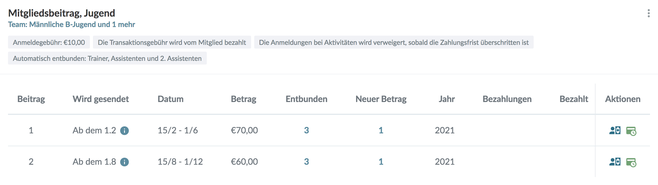 Feste Beiträge: Diese Beiträge werden an bestimmten Daten eingefordert, beispielsweise zwei mal im Jahr. Sobald diese erstellt sind, können Mannschaften mit diesen Beiträgen verbunden werden. Einzelne Spieler können jedoch immer noch entbunden werden oder einzelne Beträge können angepasst werden.