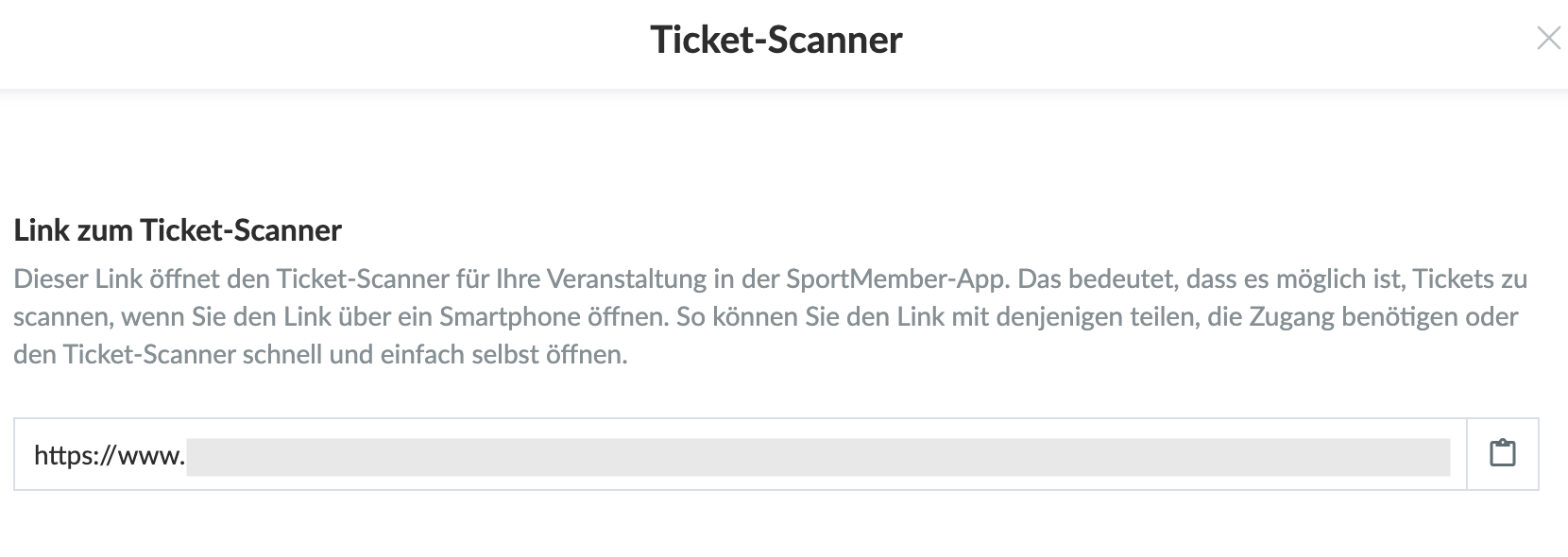 • TIPP: Auf dem Computer finden Sie auch einen Link zum Ticket-Scanner. Wenn dieser Link auf einem Smartphone geöffnet wird, wird der Ticket-Scanner in der Holdsport-App gestartet, sodass Tickets direkt gescannt werden können. Sie können den Link mit denjenigen teilen, die Zugang benötigen, oder ihn selbst zum schnellen und einfachen Scannen verwenden.