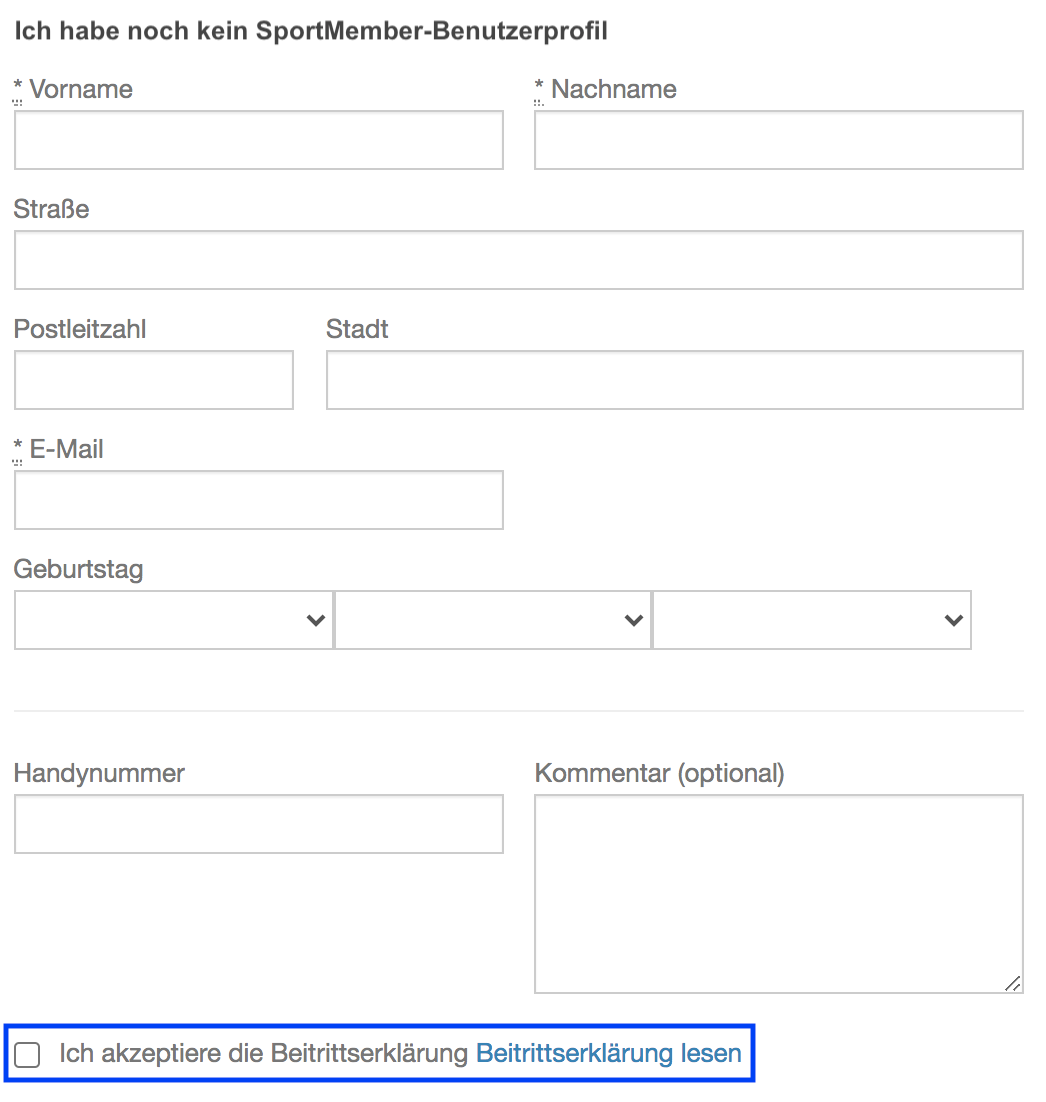 - Neue Mitglieder müssen direkt beim Anlegen eines Benutzerprofils in SportMember der Beitrittserklärung des Vereins zustimmen