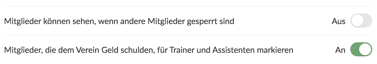 - TIPP: Du kannst auch aktivieren bzw. deaktivieren, ob andere Mitglieder einsehen können, wer aufgrund von ausstehenden Zahlungen für die Anmeldung zu Aktivitäten gesperrt ist. Dies wäre; Mitglieder können sehen, wenn andere Mitglieder gesperrt sind.