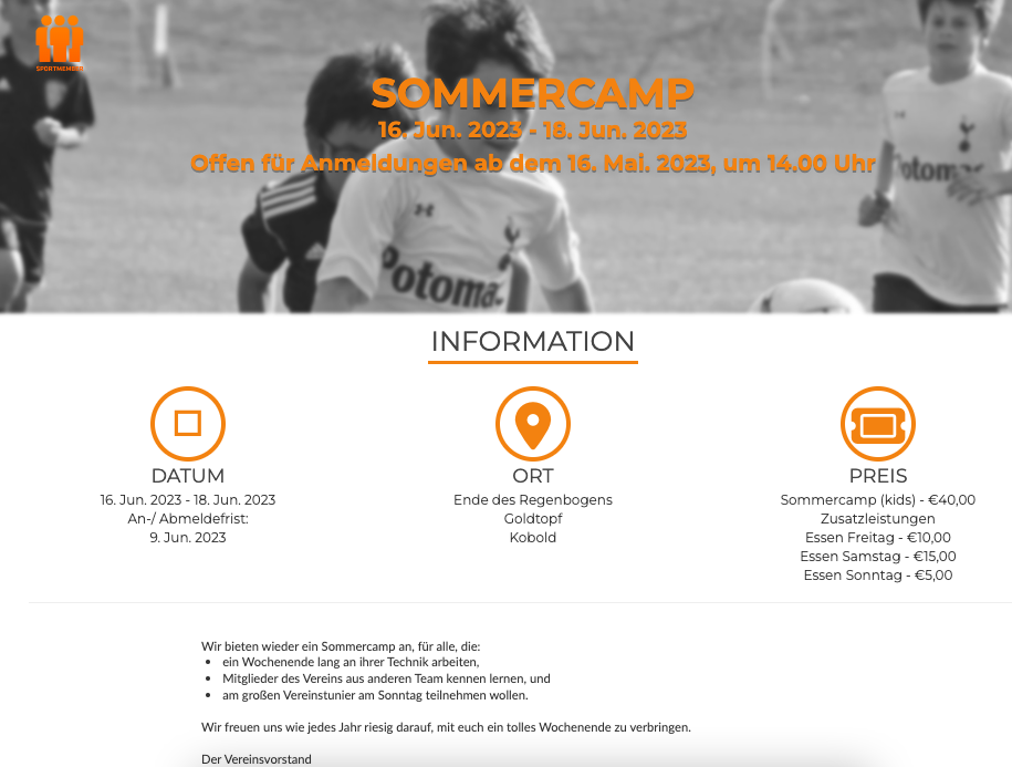- Vereins-Events wie Wettbewerbe, Camps, gesellschaftliche Veranstaltungen usw., deren Teilnahme Geld kostet