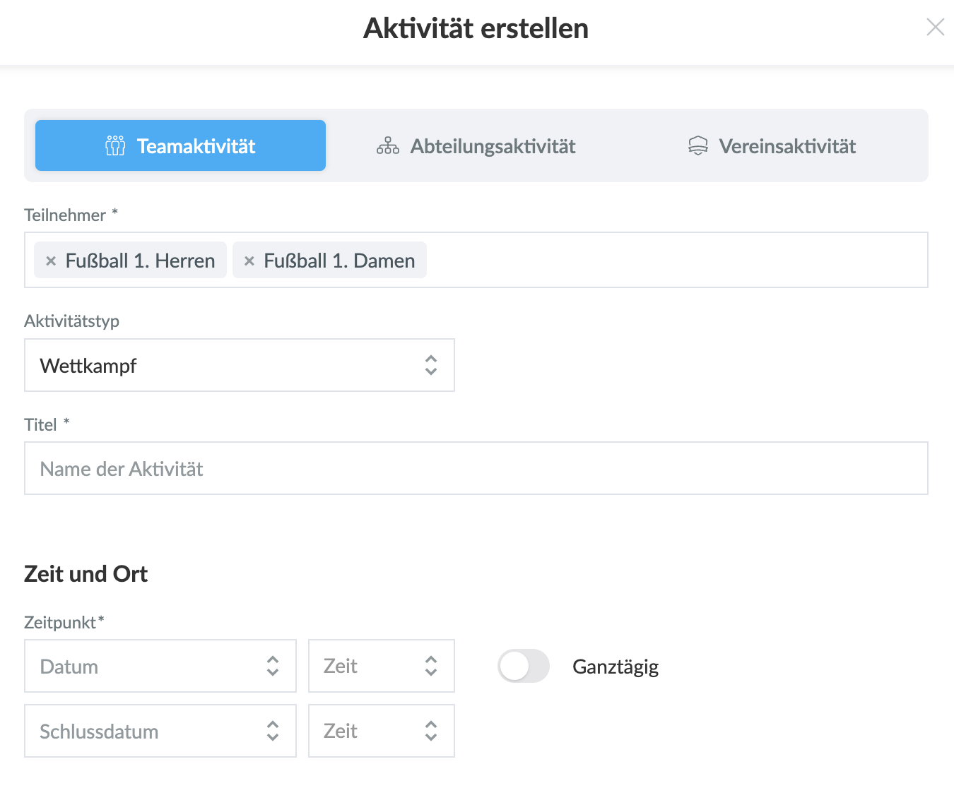 - Gebe alle notwendigen Informationen ein, wie Sie es bei einer Aktivität für ein Team
