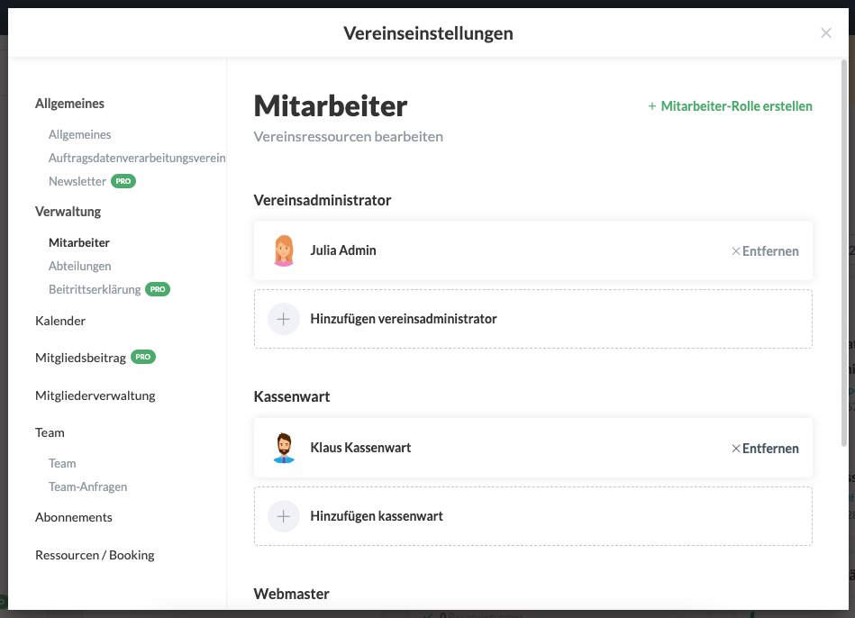 - Du kannst jederzeit neue Mitarbeiter-Rollen anlegen, wie z. B. Vorsitzende, Mannschaftskoordinatoren, Sponsoren usw., und diesen Rollen ebenfalls Rechte zuteilen