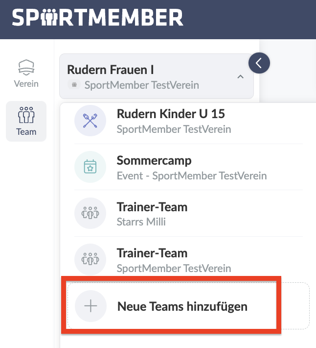 9. Wähle + << NEUES TEAM >> zum Verein hinzufügen.