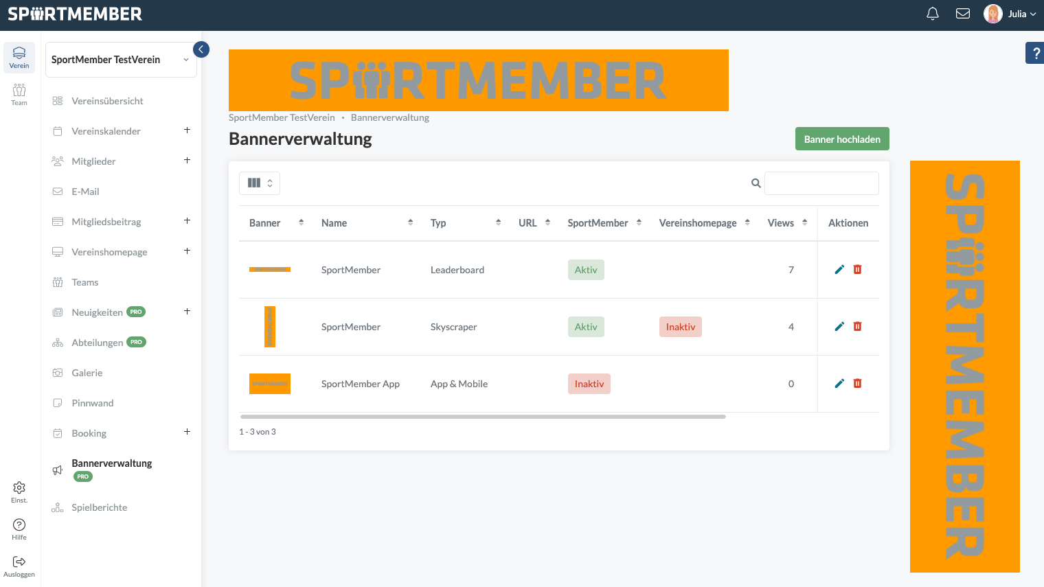 - Unbegrenzte Anzahl von Bannern hochladen, die plattformübergreifend (PC/Tablet/Handy) für alle Mitglieder des Vereins angezeigt werden