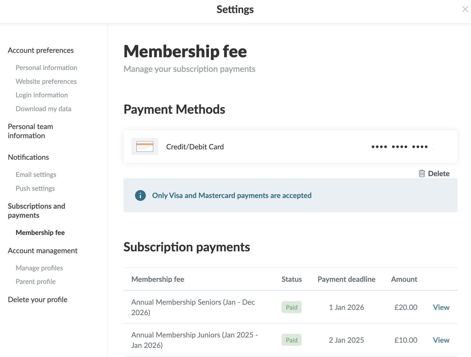 - Pay membership fees to the club directly via your SportMember app with a credit or debit card