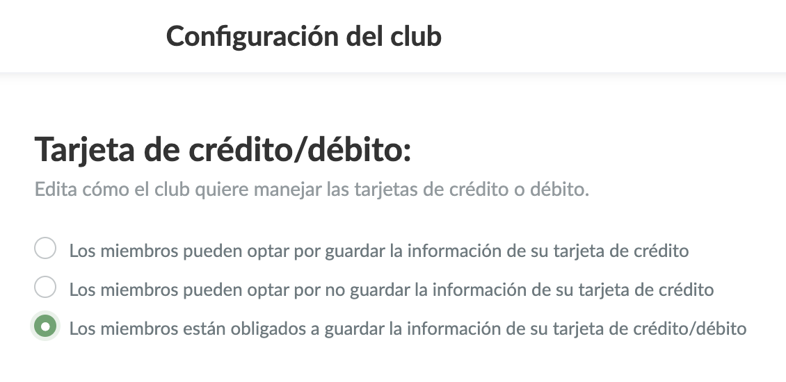 En la sección Tarjeta de crédito/débito deberás seleccionar la opción que dice "Los miembros están obligados a guardar la información de su tarjeta de crédito/débito".