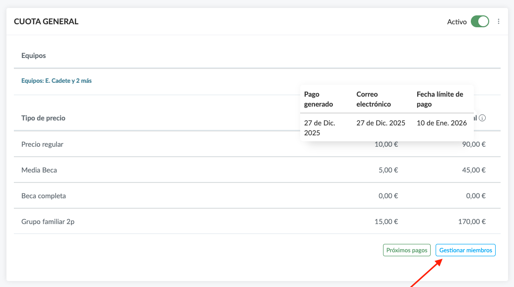 Una vez que ya creaste tu cuota, deberás asignarle a cada miembro el tipo de precio que debe pagar. Para eso haz clic en el botón azul Gestionar miembros.