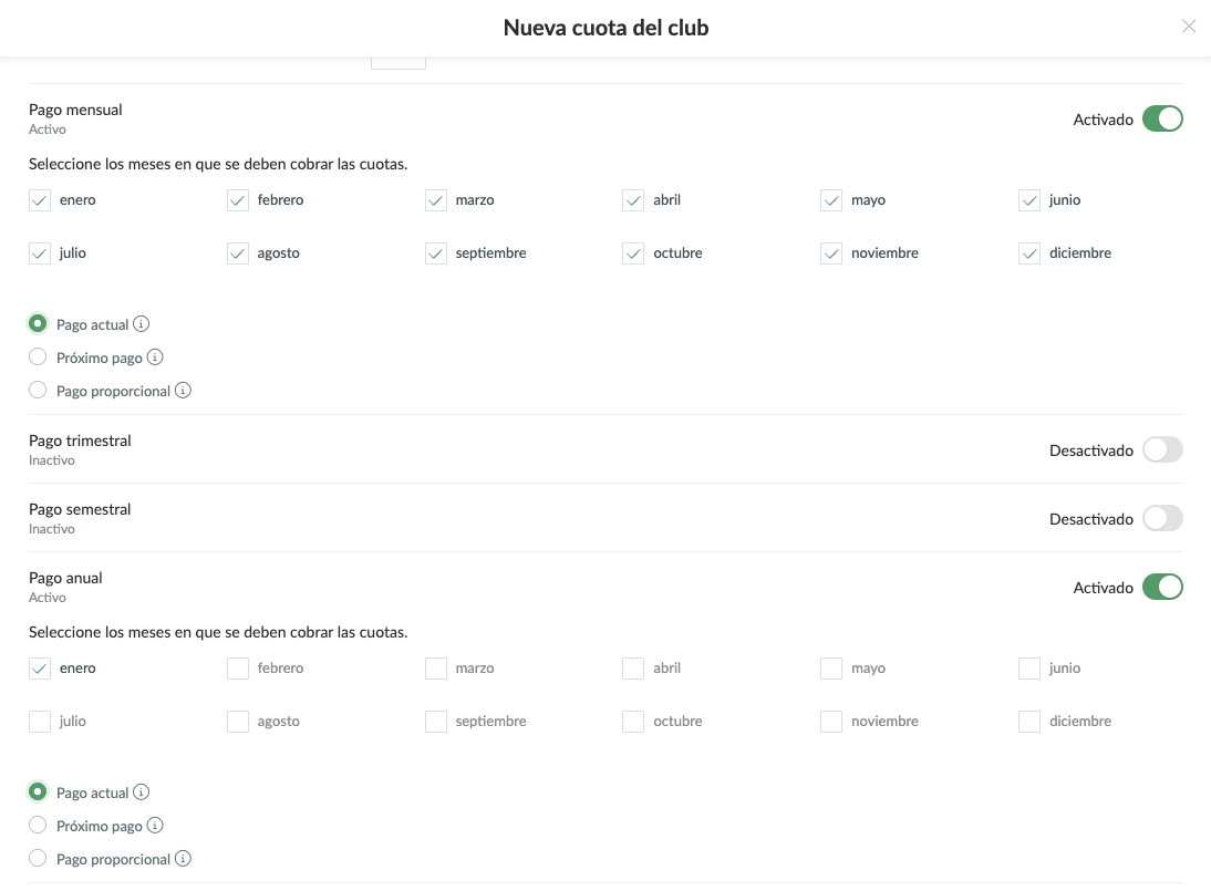 - A continuación tienes que habilitar las opciones de pago que ofrezcas en tu club, estableciendo la frecuencia de pago durante el año y/o añadir el pago de inscripción (se cobra una única vez). Puedes habilitar la cuota en modalidad mensual, trimestral, semestral y/o anual.