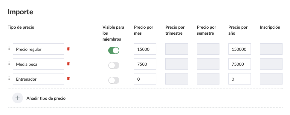 Para finalizar, deberas crear los diferentes tipos de precios que tengas en el club. Por ejemplo, un tipo de precio para el precio regular, otro para alumnos con media beca, o beca completa. Si los entrenadores no pagan cuota, deberás crear un tipo de precio en 0, para poder asignarselo y que el sistema no les genere cuota.