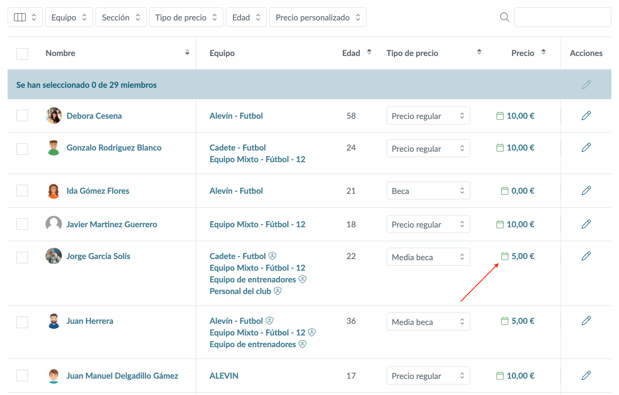 NOTA: Al cliquear en el icono verde del calendario podrás modificar los importes de los próximos pagos, aplicar descuentos, recargos o exceptuar del pago a miembros específicos. Por ejemplo, si algún deportista se lesiona y no quieres cobrarle el siguiente mes, pero pasado ese periodo se le volverá a cobrar la cuota asignada.
