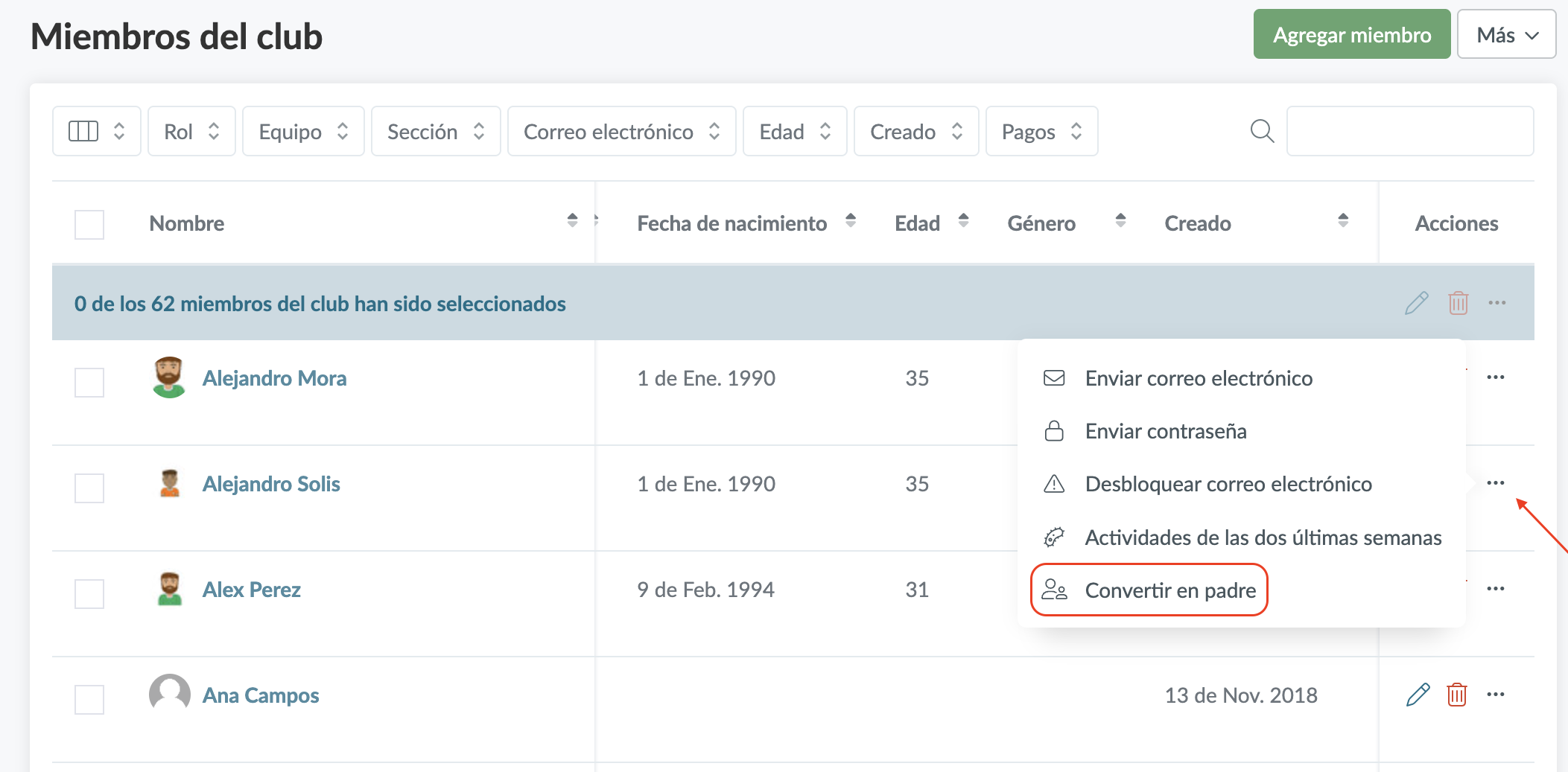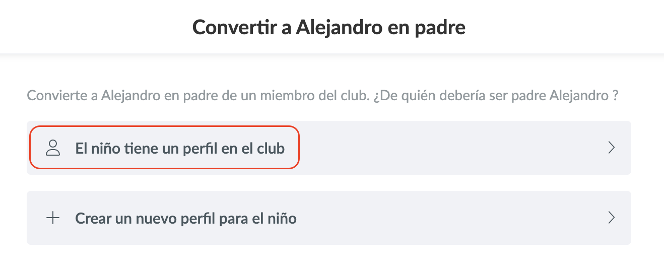 - Como administrador, puedes vincular dos miembros de tu club como padre/hijo.