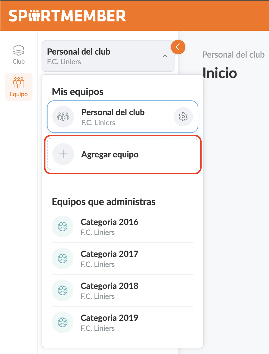 9. Haz clic en + Agregar "Equipo XXX" a un club
