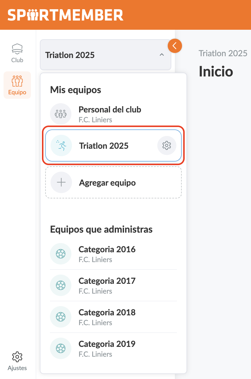 6. Haz clic en el menú desplegable con el listado general de equipos, y selecciona el equipo recién creado.