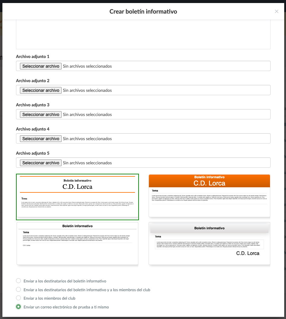Podrás diseñar y enviar el boletín informativo del club en diferentes formatos. Solo tienes que elegir el diseño que mas te guste y seleccionar las personas a las que quieres enviárselo.