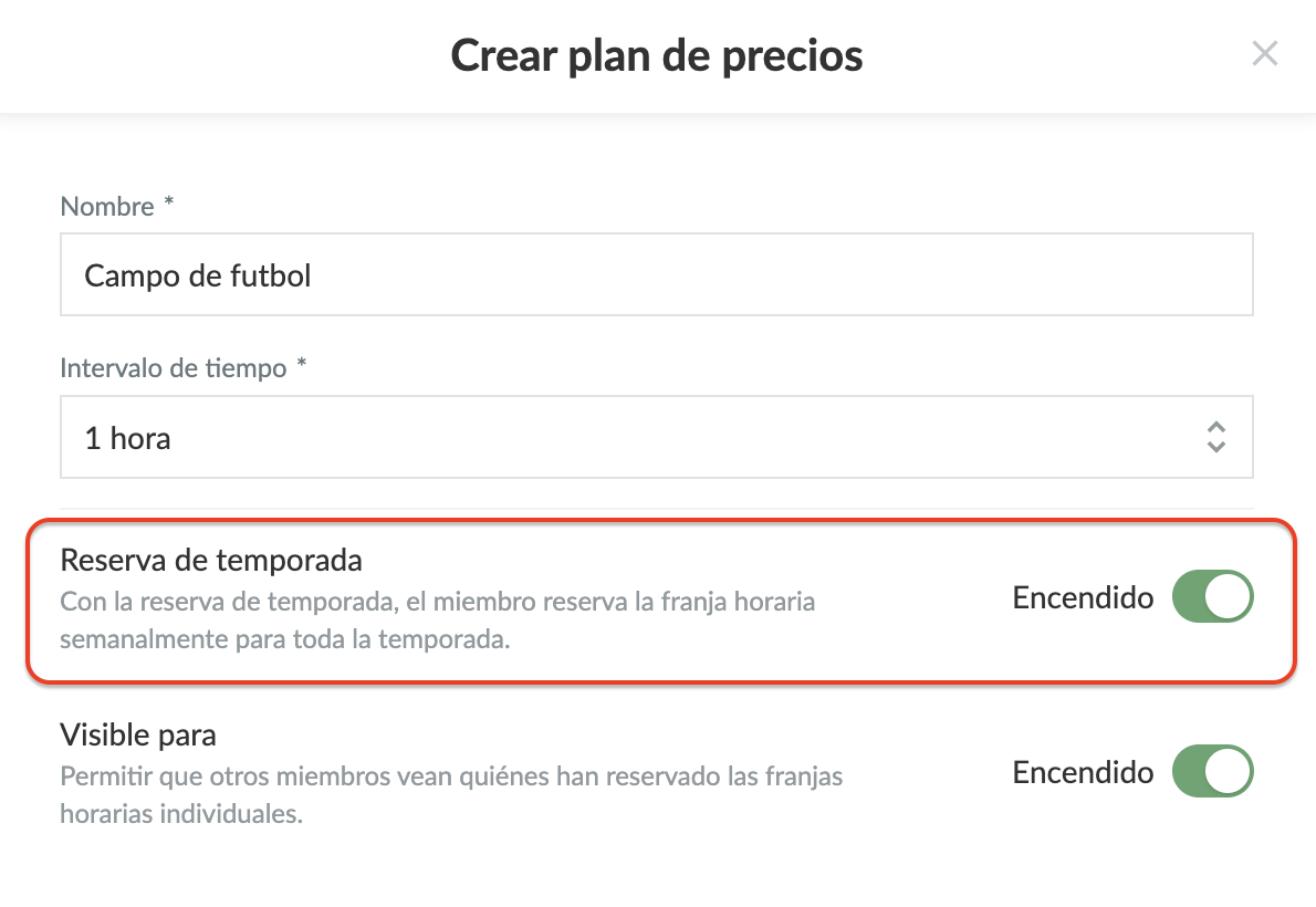 Si quieres que los entrenadores/ asistentes/ miembros del club reserven la misma franja horaria todas las semanas para el resto de la temporada, tienes que habilitar la reserva de temporada al crear el plan de precios.