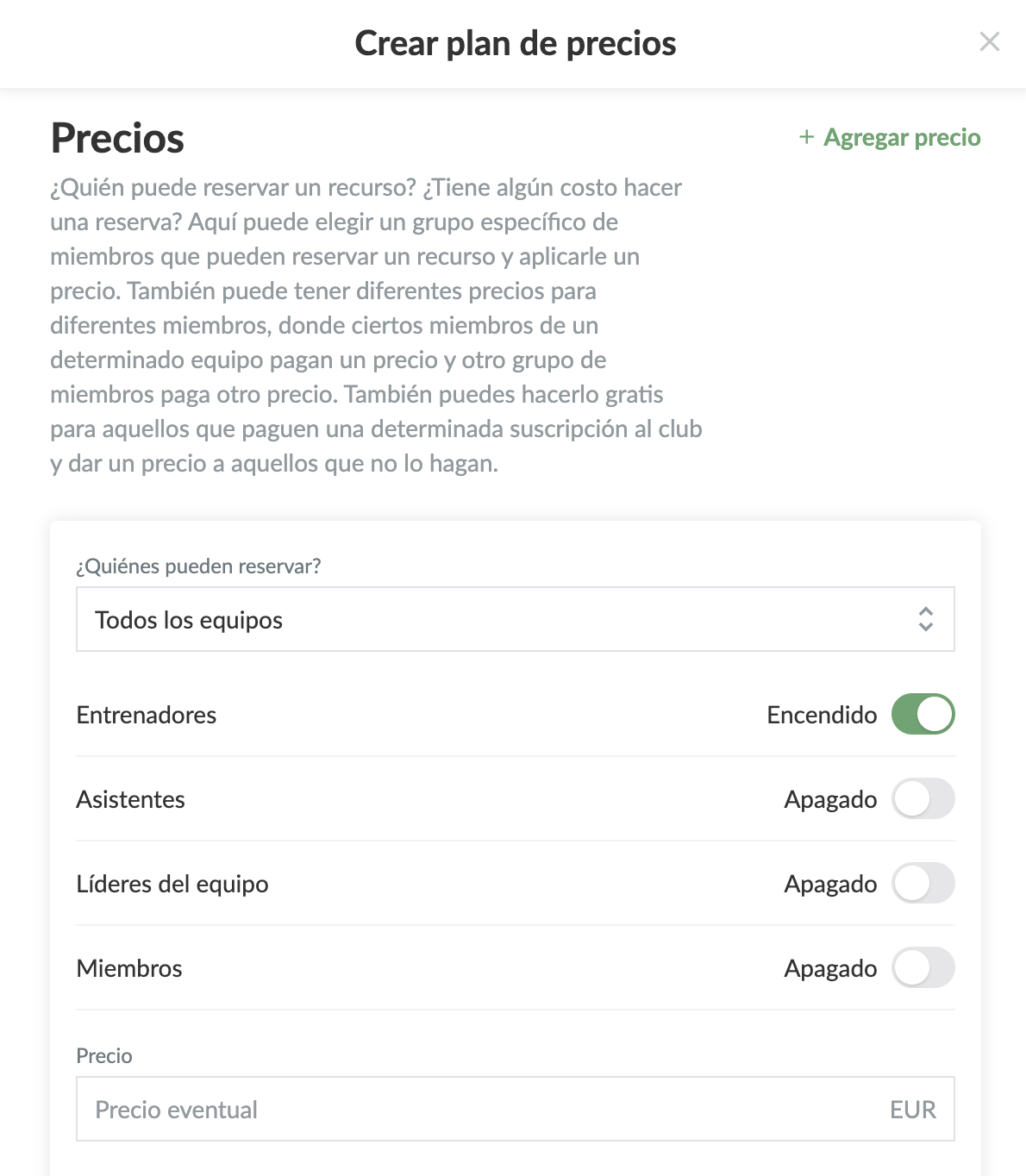 NOTA: Si eliges esta opción para que los entrenadores puedan reservar el campo para entrenar, puedes definir el plan de precios para que solo los entrenadores puedan reservar la franja horaria, tal vez incluso sólo de un equipo específico.