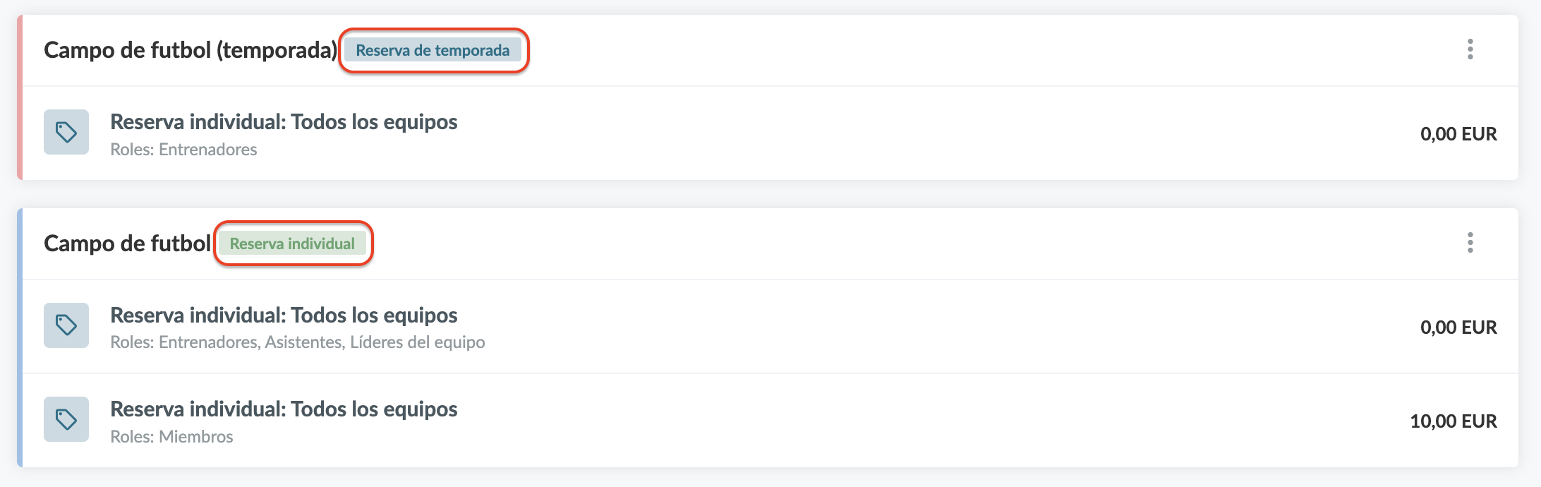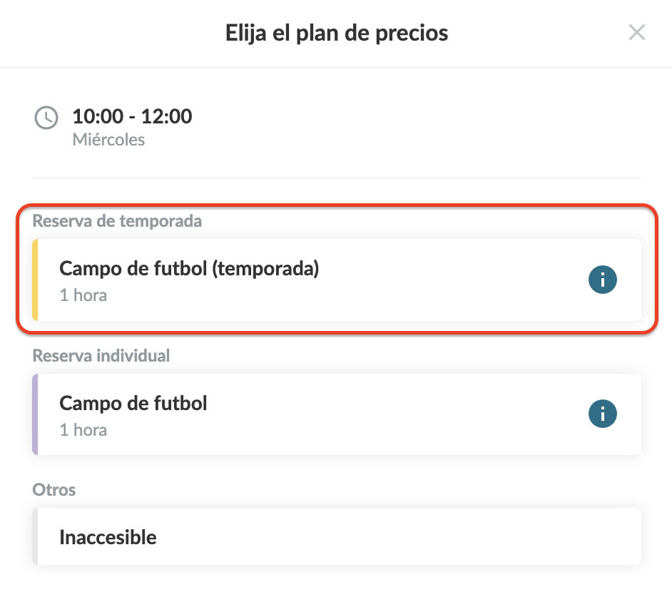 También puedes tener dos planes de precios para un recurso. Por ejemplo, el campo de fútbol se puede reservar para entrenamientos durante el día, pero durante las tardes los miembros del club pueden reservarlo. Podría ser útil tener una reserva de temporada para los entrenamientos, pero cuando los socios pueden reservar el campo deben ser reservas individuales.