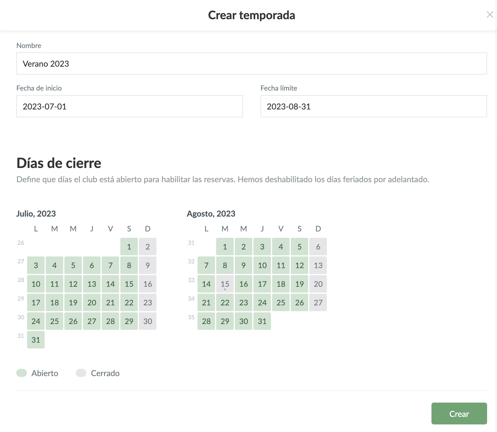 - También puedes deshabilitar determinados días de la semana. ¿Está tu club cerrado los domingos? No hay problema, puedes deshabilitar el día al definir al temporada