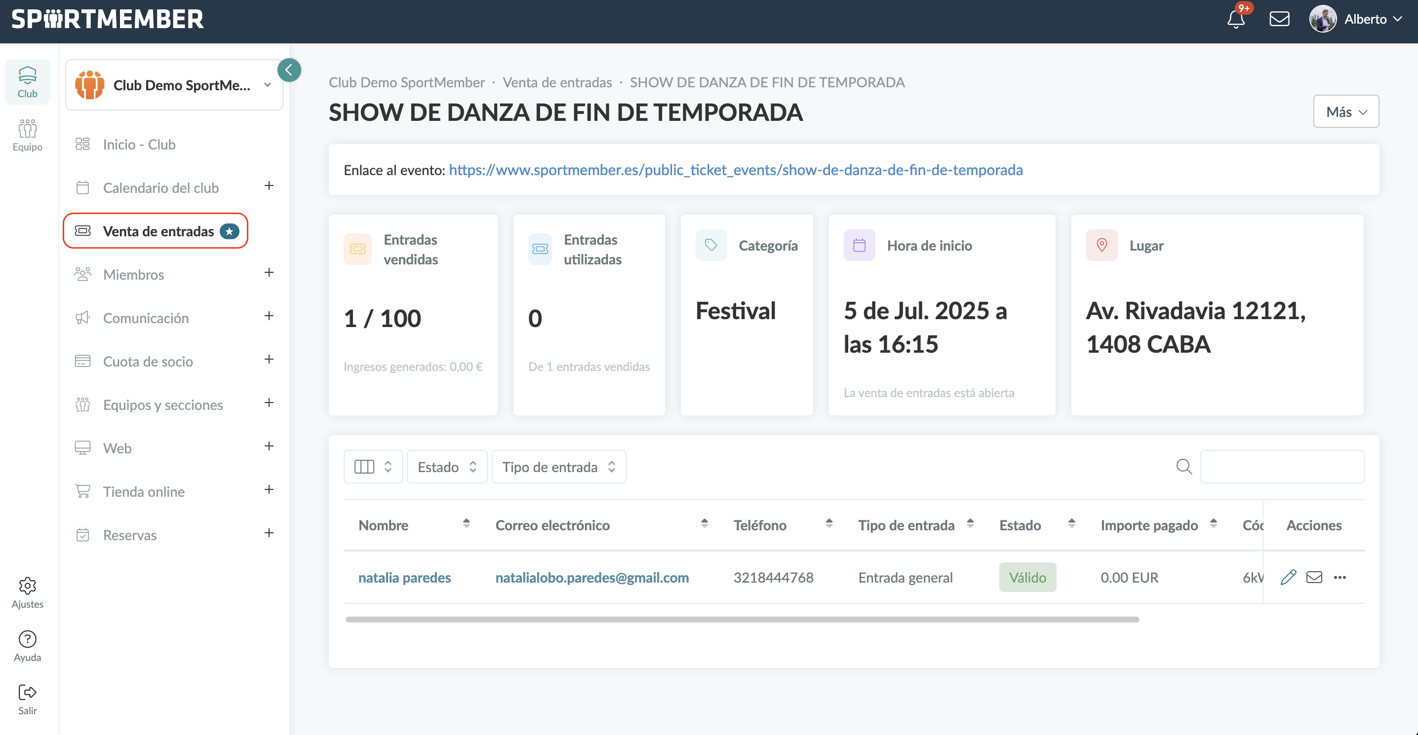 - Sólo los administradores del club y los encargados de la venta de entradas pueden crear eventos