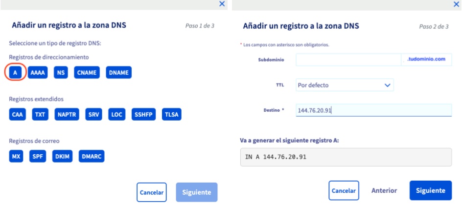 En el Paso 1 de 3 deberás seleccionar el tipo de registro A, y luego haz clic en Siguiente