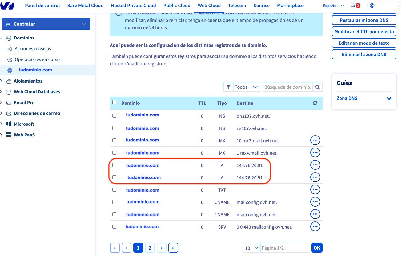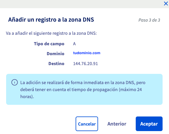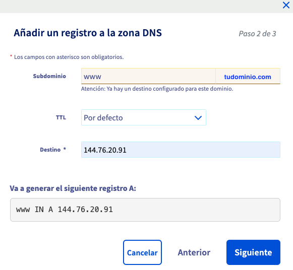 NOTA: Si tu dominio ya tiene una dirección IP asociada, primero debes eliminar los otros registros A.