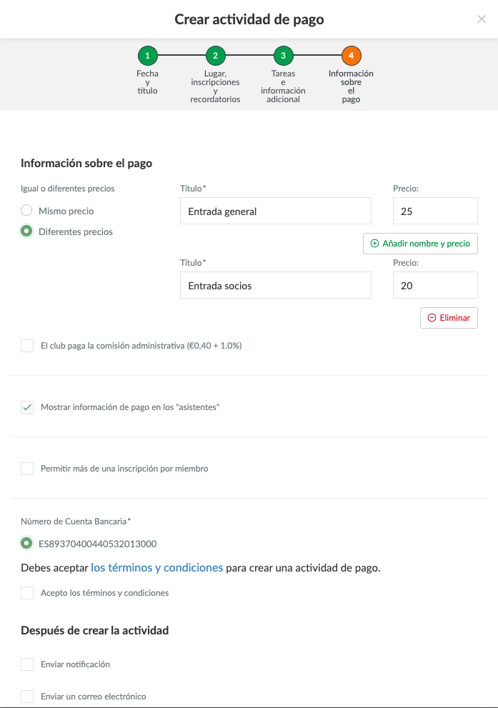 CONSEJO: Te recomendamos que definas una fecha límite de inscripción y, preferiblemente, un número máximo de participantes al crear la actividad de pago. Así te asegurarás de que la gente pague a tiempo y de que tienes suficientes entradas.